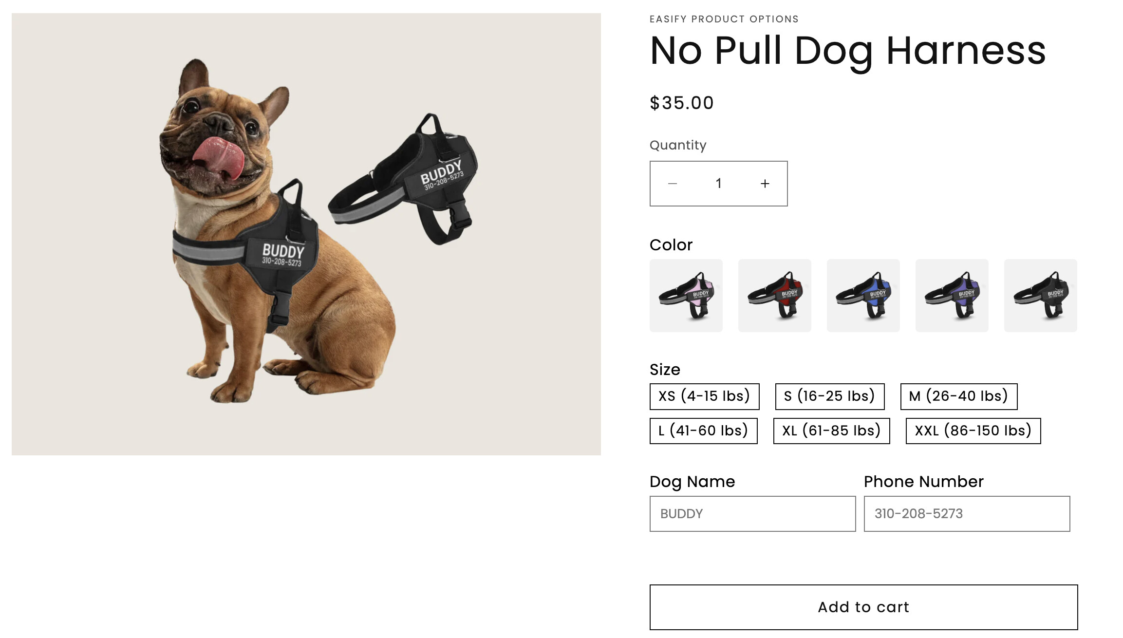 A convenient solution for incorporating a text box for customer-provided names on your dog harness product is to utilize the free Easify Product Options app.