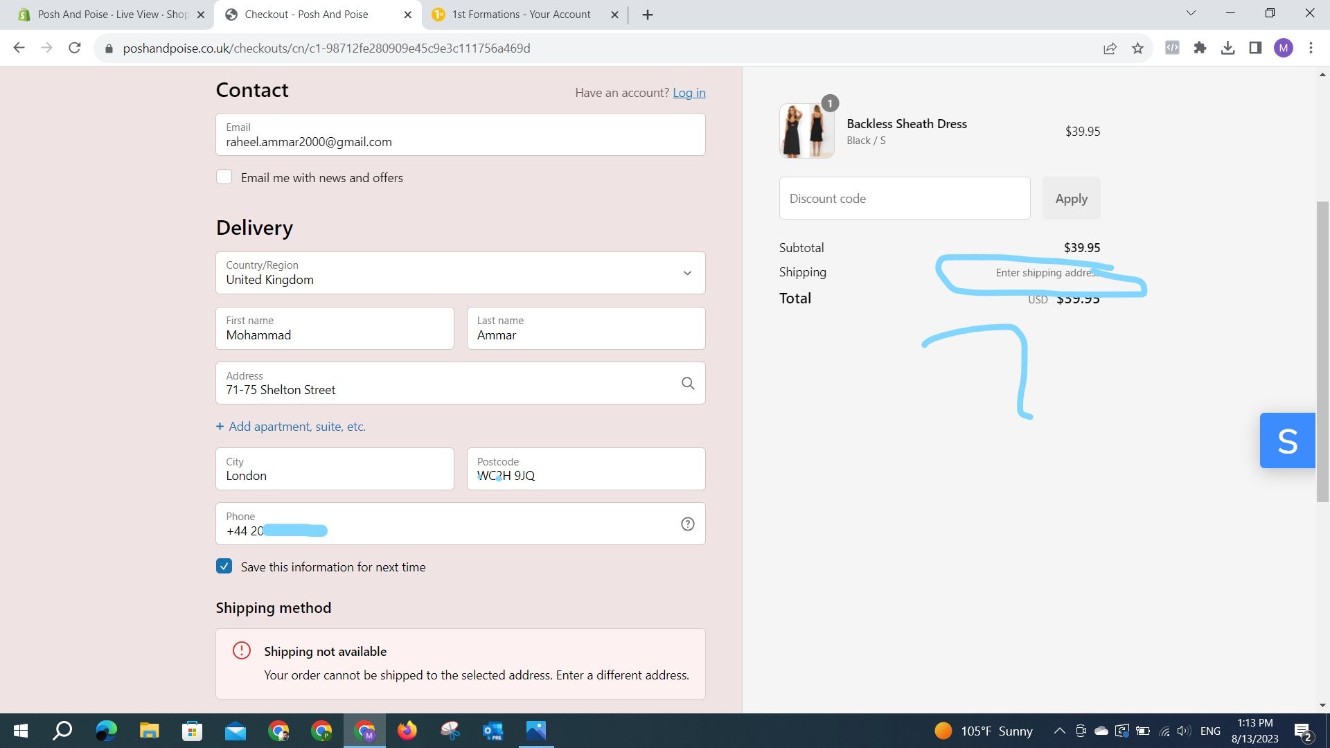 Hello, as you see in the screenshot, the shipping isn’t available, and on the right side says to enter the shipping address despite being entered. No new app was added, and nothing changed previously related to such a thing, only regular customization without coding manipulation.