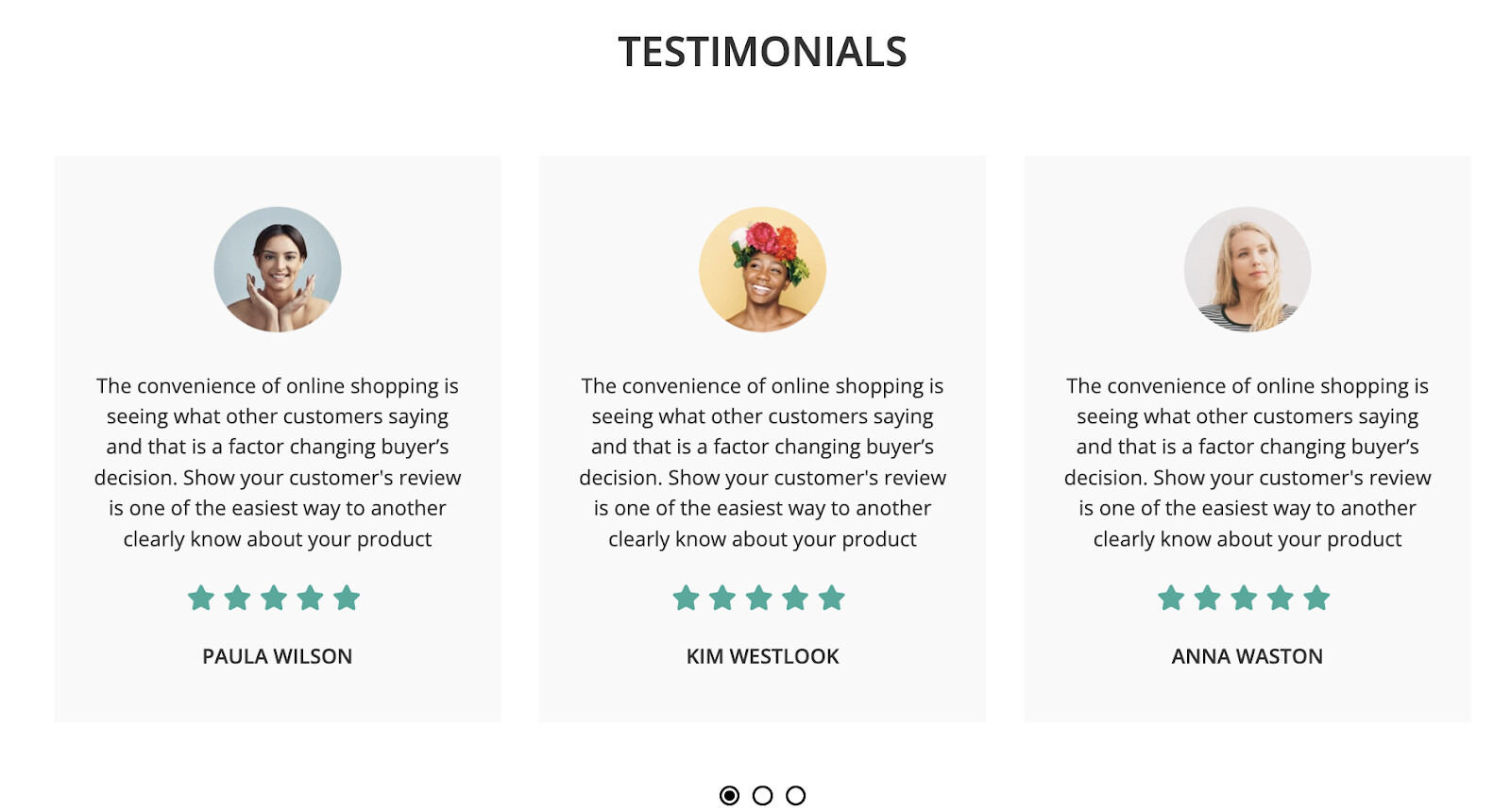 Customer reviews are proof of your product quality. This section will help you build customers’ trust. You can show rating stars for each product or you can add customer reviews as text and photos.