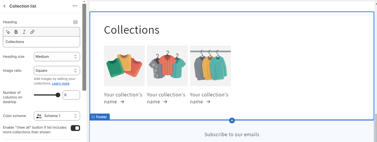 CSS Workaround: A code snippet is provided to hide collections beyond the first 6 using CSS targeting (nth-child(n+7)), though this doesn’t add the requested “View All” button.