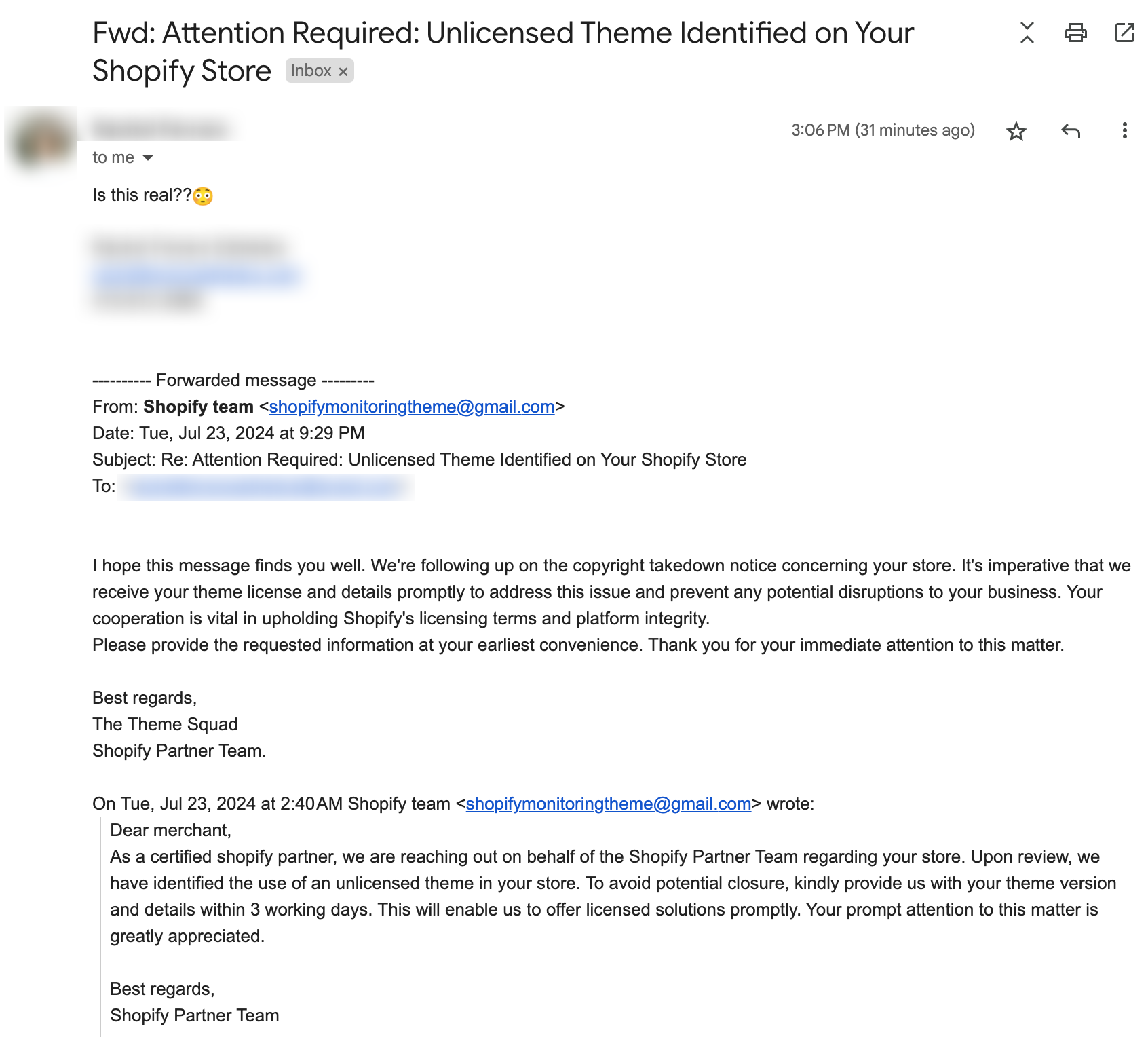 Okay, I just want to mention, in the scenario that this IS a fake email, it’s not obvious, very difficult to tell, this came from shopify@shopifypartnersteam.com which seems incredibly legit, have I actually received a real email here??