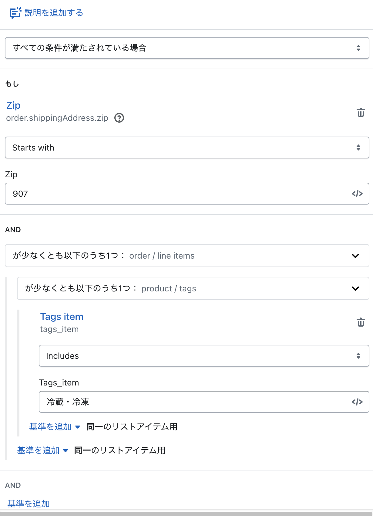 Tagsが「冷蔵・冷凍」を含む、かつzip(郵便番号)907で始まる(=沖縄県)場合、メールを送る