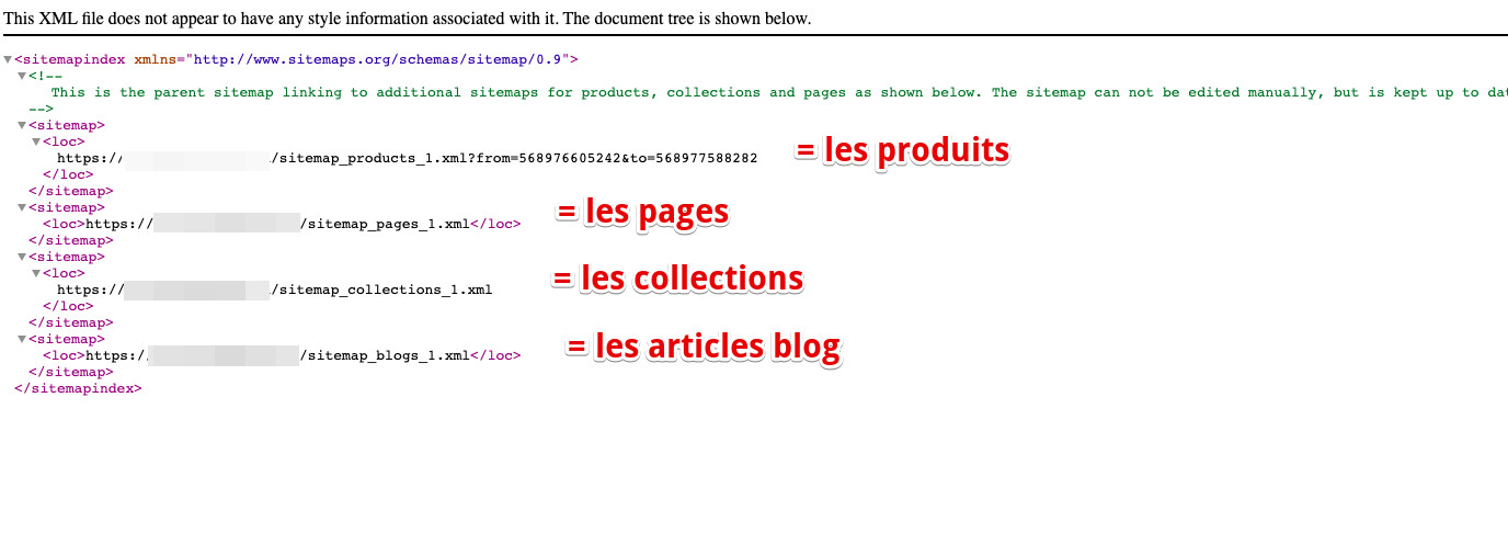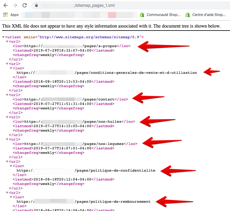 Vous pouvez trouver tous les liens qui sont indexés en ajoutant /sitemap.xml à la fin de votre URL de boutique. Vous allez voir cette page :