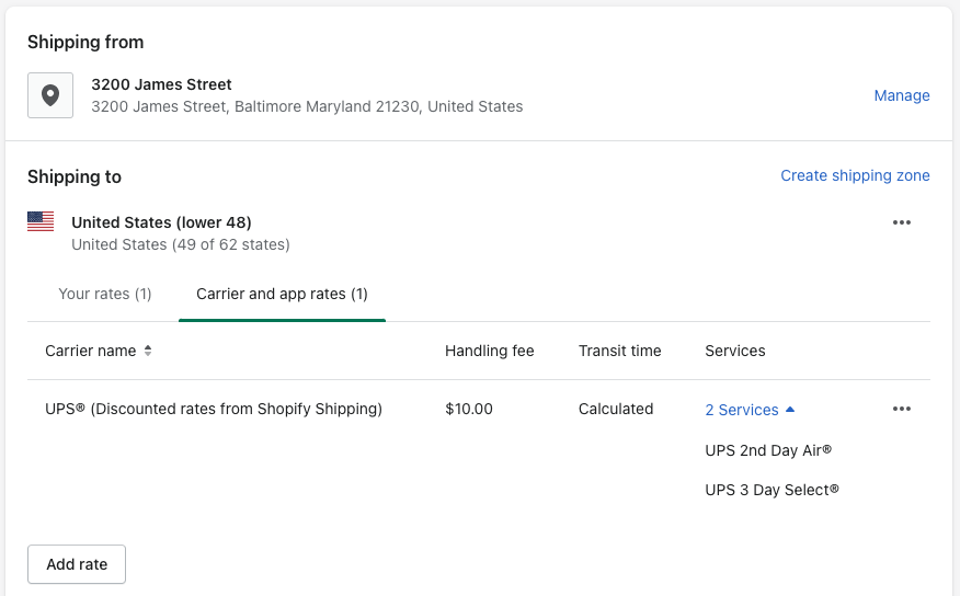Currently my store is only showing my custom shipping rate at checkout. The carrier rates I have enabled from UPS do not appear as options under “Shipping method”. I would like for all of the options to be listed, with my custom rate – called UPS Ground (5 to 8 business days) – being Free and the 2 UPS options for UPS 2nd Day Air® and UPS 3 Day Select® showing the calculated shipping rate appropriately.