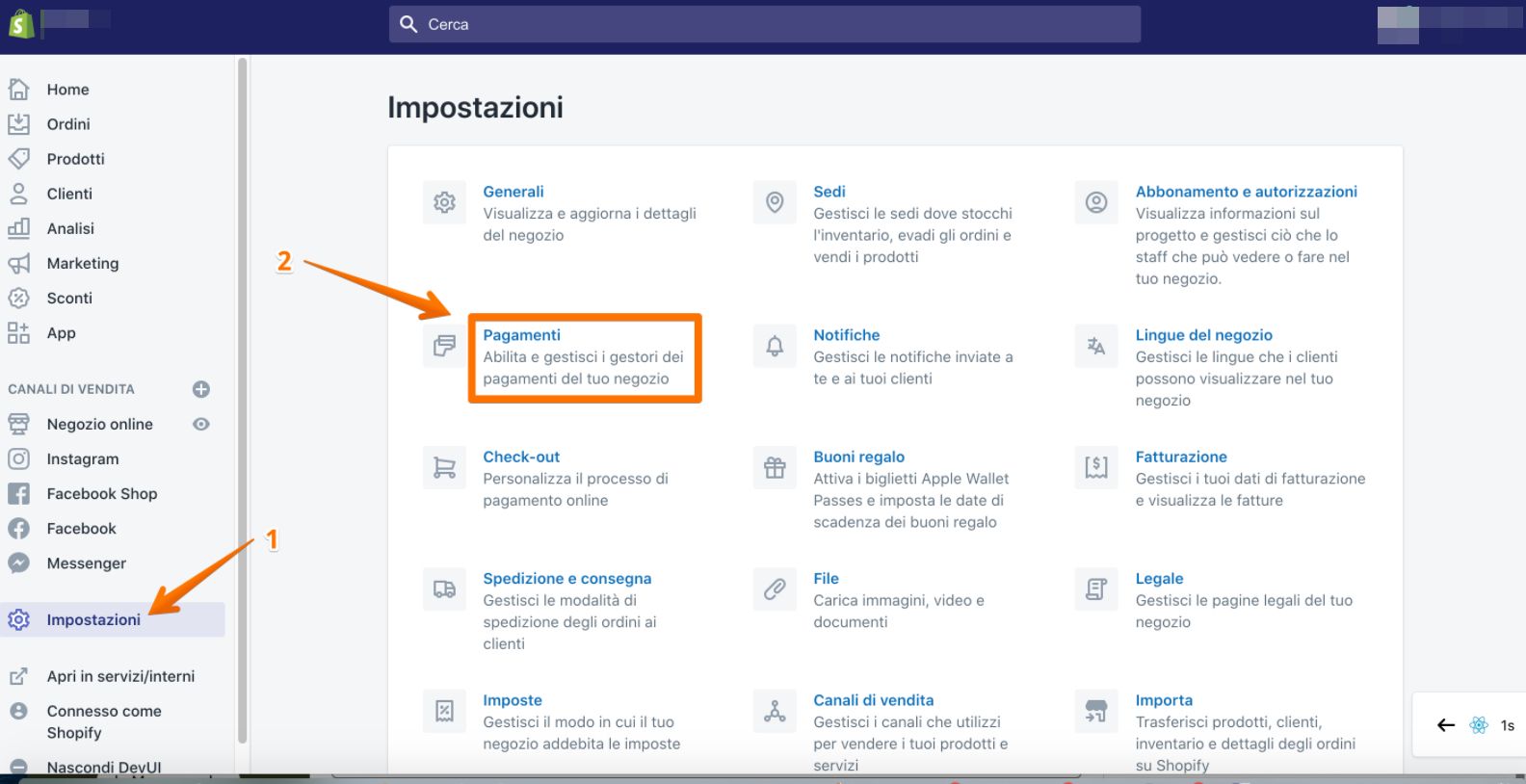 - Dal pannello di controllo Shopify, vai a Impostazioni > Pagamenti.