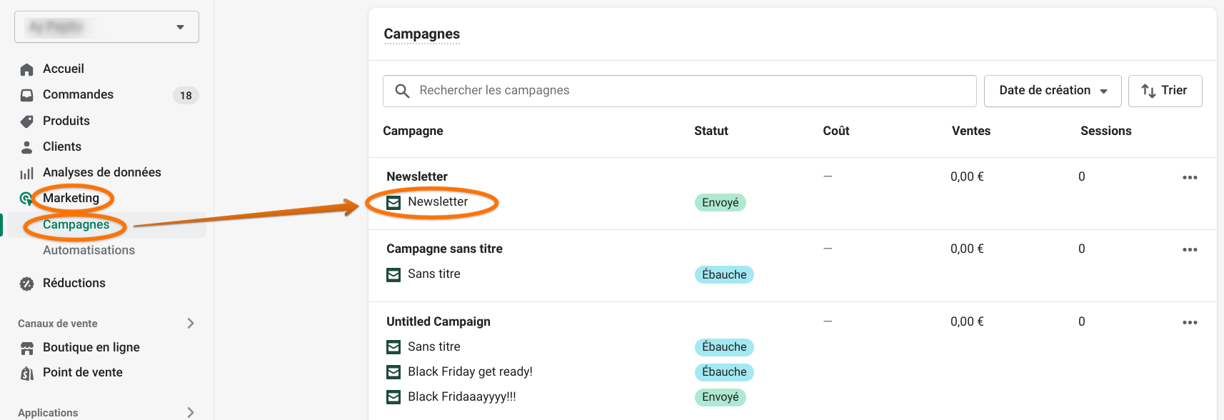 Pour répondre à votre question, Shopify Email vous permet effectivement de consulter le nombre total d’e-mails qui ont été ouverts pour chaque campagne d’emailing. Afin d’afficher le rapport d’analyse de vos campagnes, rendez-vous sur Marketing > Campagnes puis sélectionnez votre newsletter :
