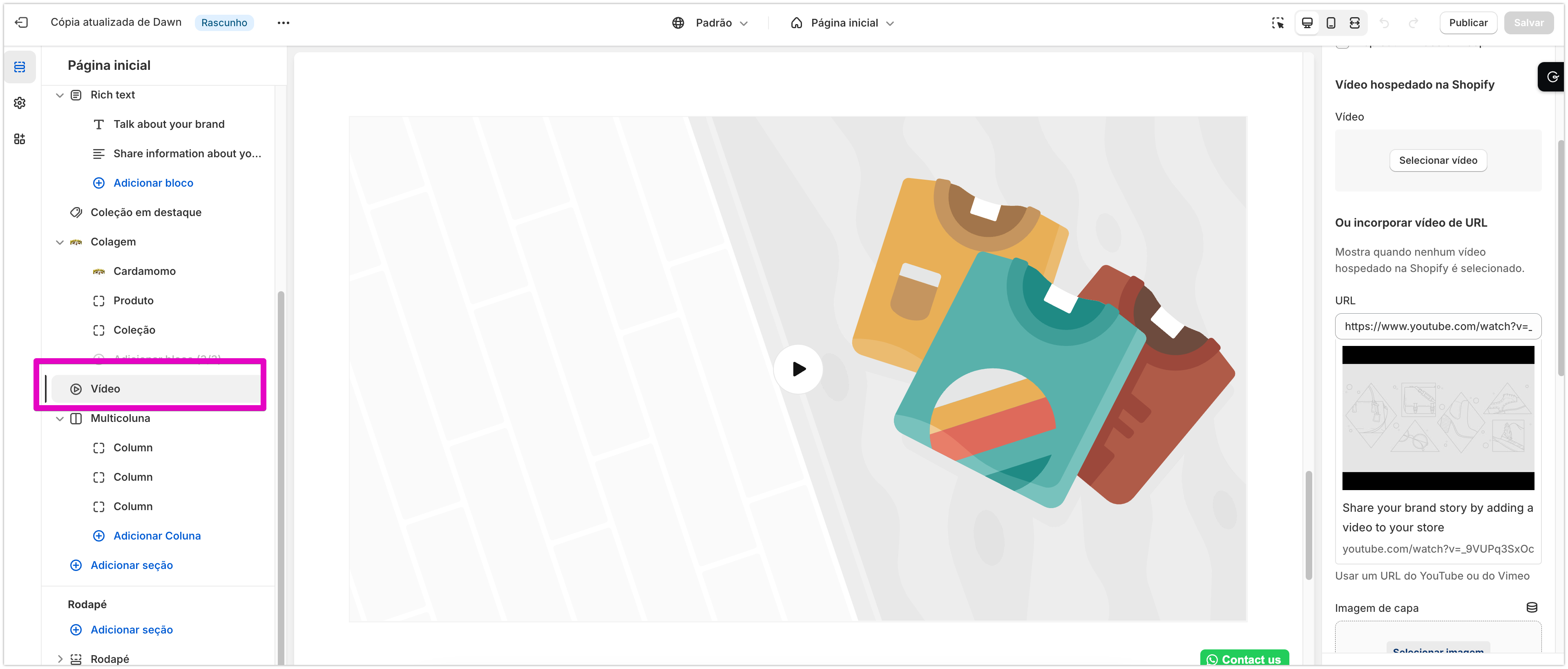 De qualquer forma, deixarei aqui algumas sugestões. Vejo que está adicionando o vídeo na home utilizando a opção Video do seu tema. Como esse tema não é produzido pela Shopify, não temos conhecimento de como ele funciona. Parece que ele também não é um dos temas de terceiros disponíveis em nossa loja de temas, por isso não posso nem instalar em minha loja para testar.