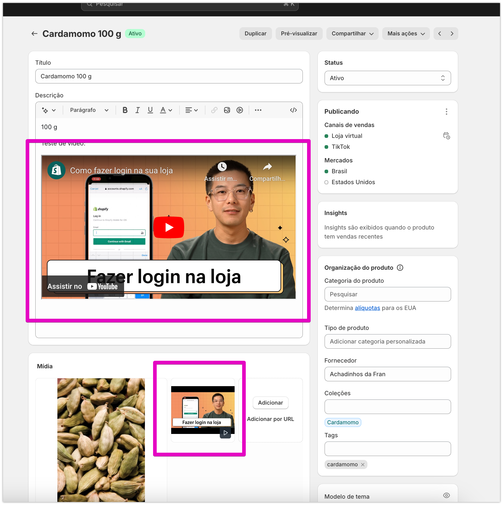 - Como você colocou o vídeo em sua loja? Foi através de codificação, utilizando ferramentas disponíveis no tema da loja, ou diretamente em um editor de texto do admin? Por exemplo, na página de produtos é possível incluir vídeos na descrição, e na mídia de produto.
