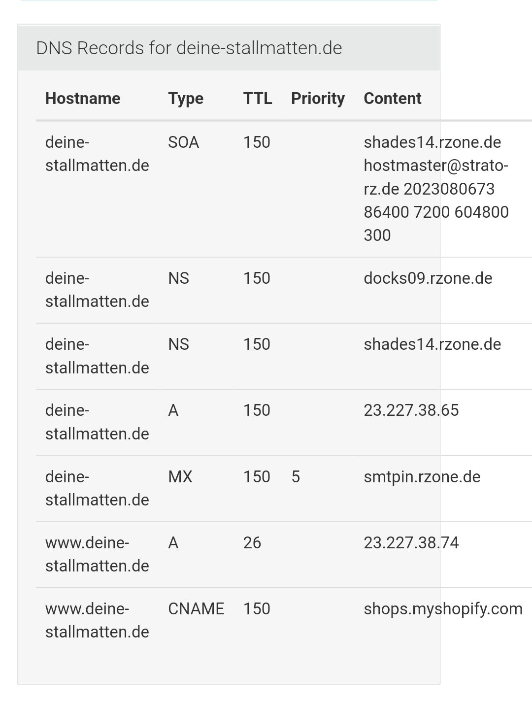 unter deine-stallmatten.de sieht man, dass der A record korrekt auf shopify verweist. Der CNAME nicht. Den CNAME kann man bei strato nur in der subdomain ändern, das habe ich getan