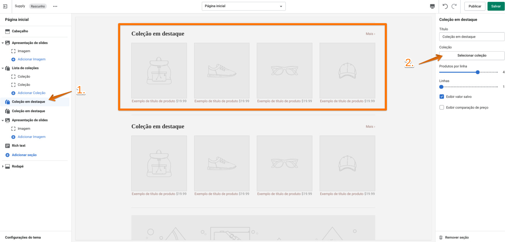 Assim que tiver as suas coleções, basta ir em Loja Virtual> Temas> na linha do tema que está trabalhando clique em Personalizar para acessar o editor de tema. Na página inicial, selecione a seção Coleção em destaque para selecionar a coleção de sua escolha, como mostro no exemplo abaixo: