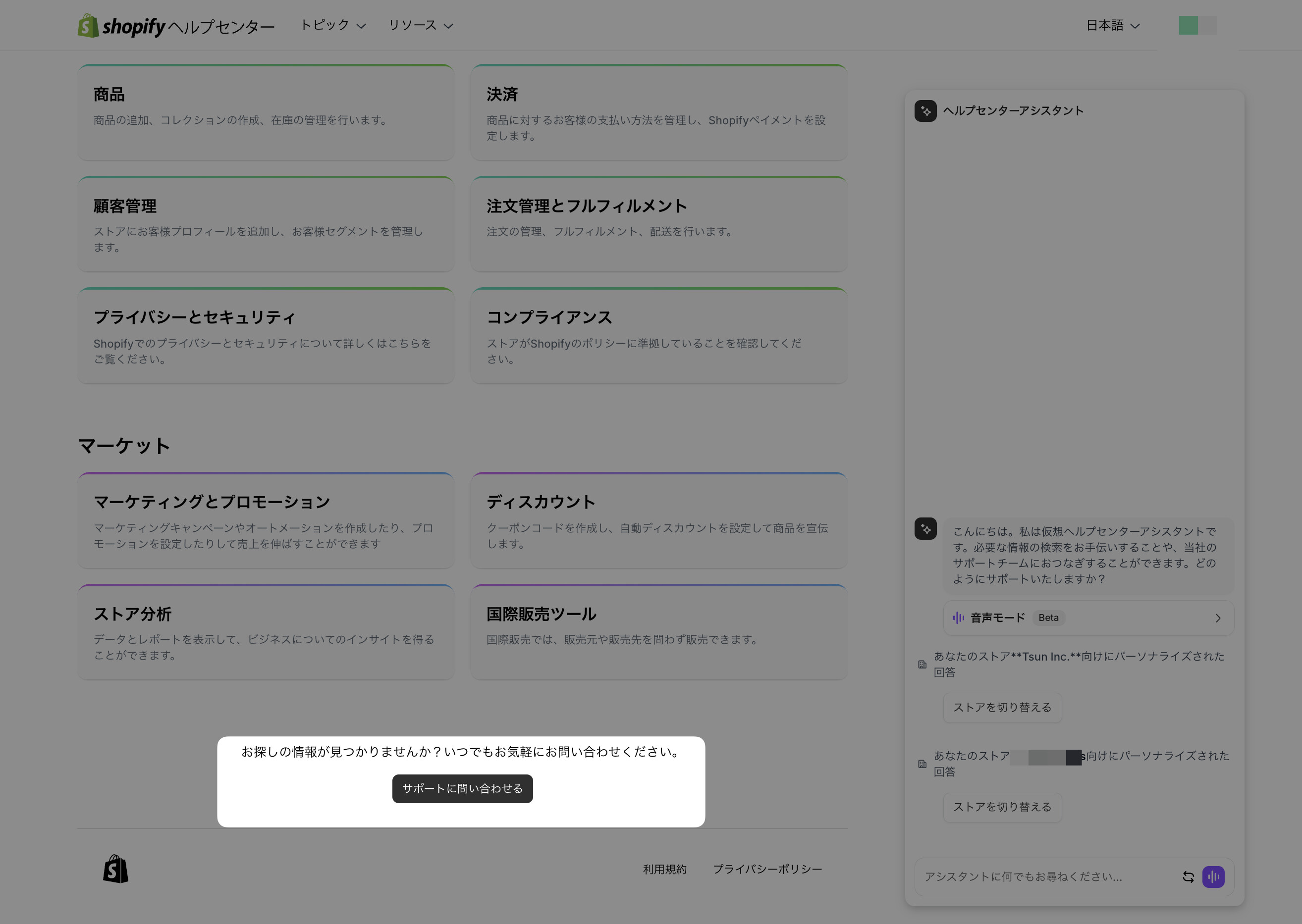 Shopifyサポートへはヘルプセンターの下部にある「サポートへ問い合わせる」よりお問い合わせが可能です。
