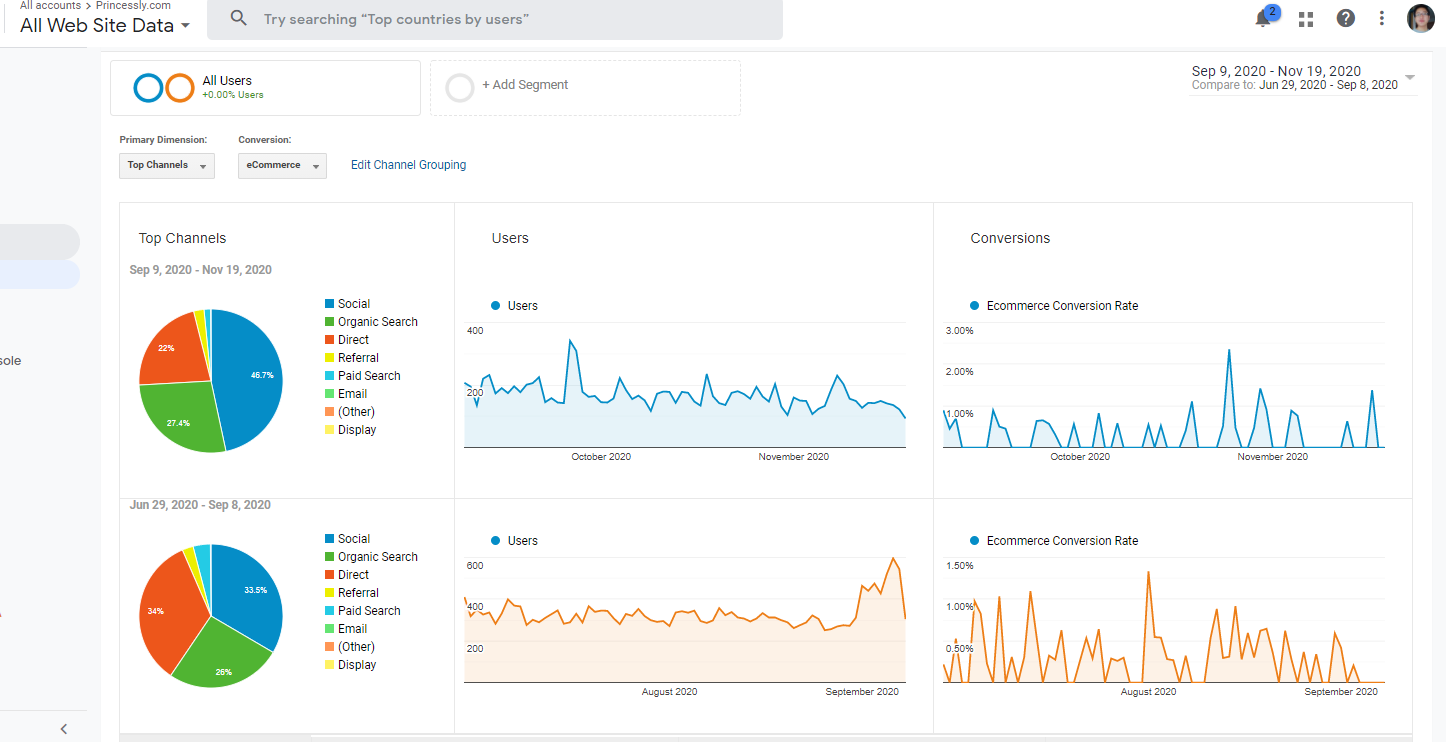 Also as a comparison, here’s the stats of May 19, 2019-Nov 19, 2019 in GA for Princessly.com when it’s still on Magento, so we can rule out the season factor. Traffic is actually climbing as we sell through summer to fall.