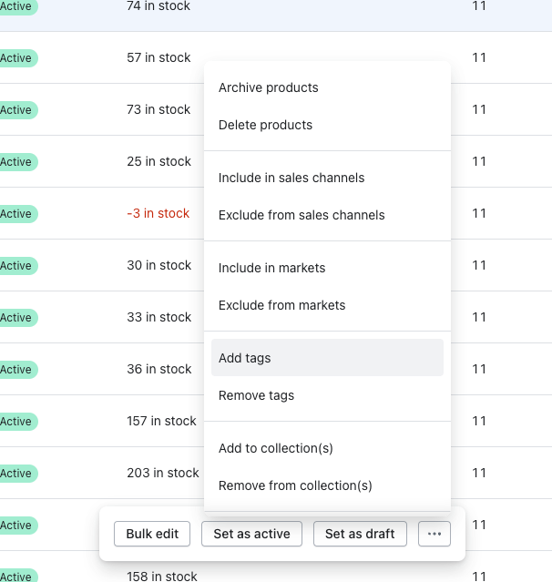 The way these products were tagged was using the “Add Tags” button under the “…” button on the products page.