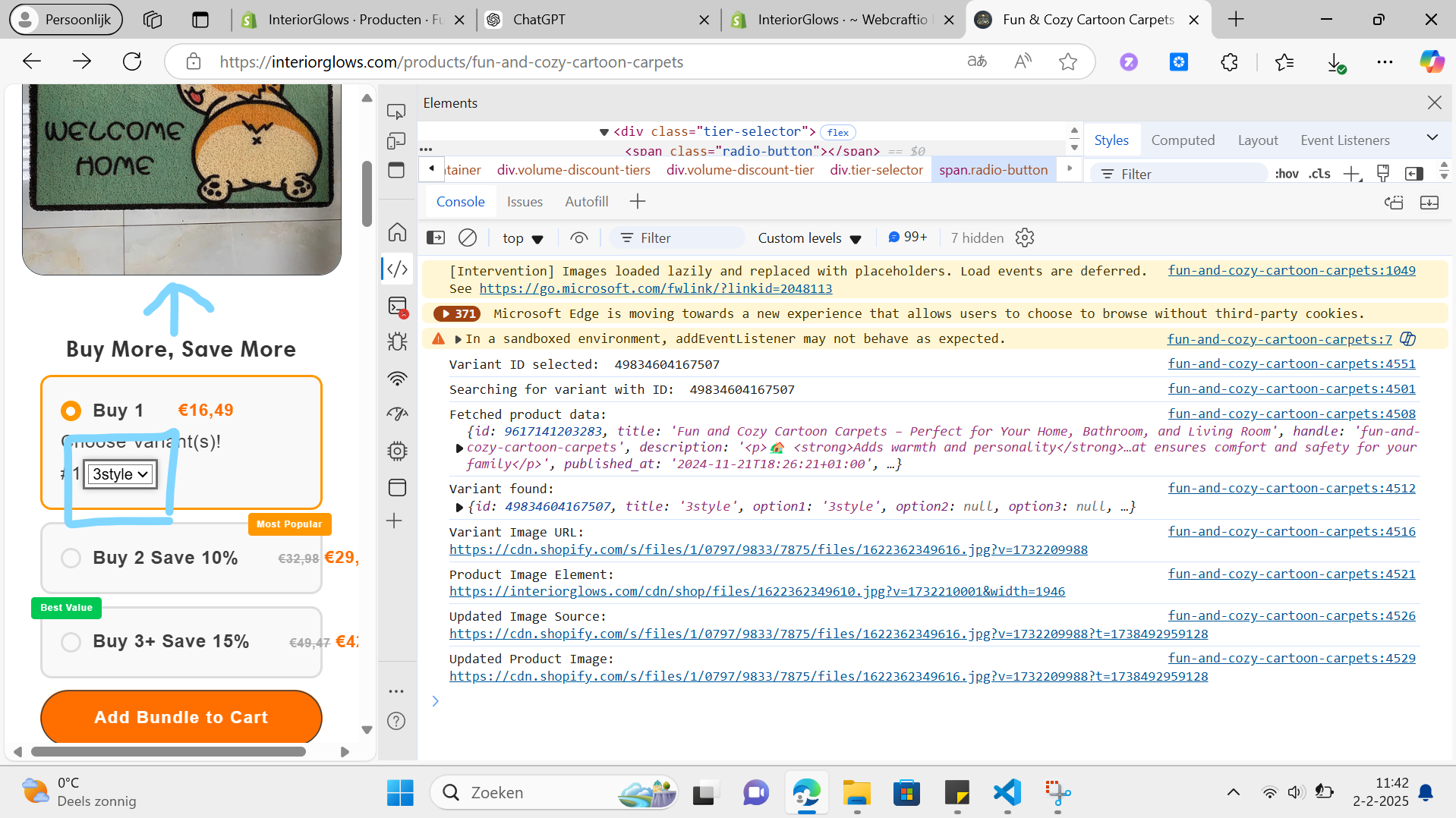Hello, I’m trying to update my product image after variant change within my self coded bundle, but I’m changing it and nothing is happening. I got this code: Feb 02 11:45 AM - Codeshare. The debug messages show as like the image should have changed. Store URL: Fun & Cozy Cartoon Carpets for Home & Kids’ Rooms – InteriorGlows