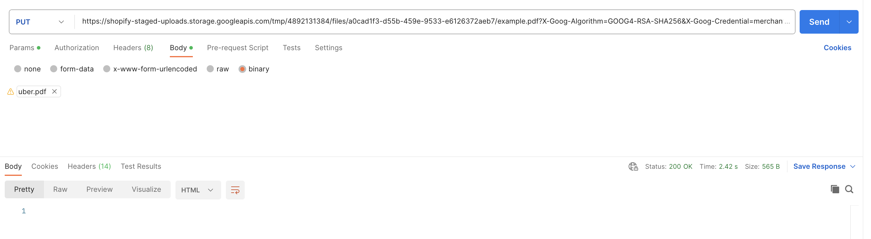 Upload the file (A PUT request to data.stagedUploadsCreate.stagedTargets.url from step 1. If you want to test in Postman here’s an example screenshot.