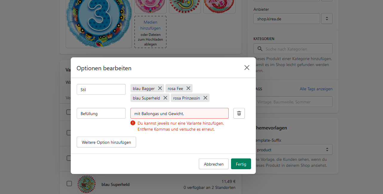 Die Option “Befüllung” soll aus zwei Varianten bestehen. Wie mache ich das? Es kommt eine Fehlermeldung: “Du kannst jeweils nur eine Variante hinzufügen. Entferne Kommas und versuche es erneut.”