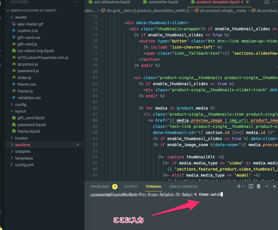 ですがこれから編集等の作業はVSCodeから行って良いものなのか・・・?VSCodeからShopifyのliquid code等ファイルは開けるようですが、これはターミナルでの作業によりセットアップ完了ということなのでしょうか・・・
