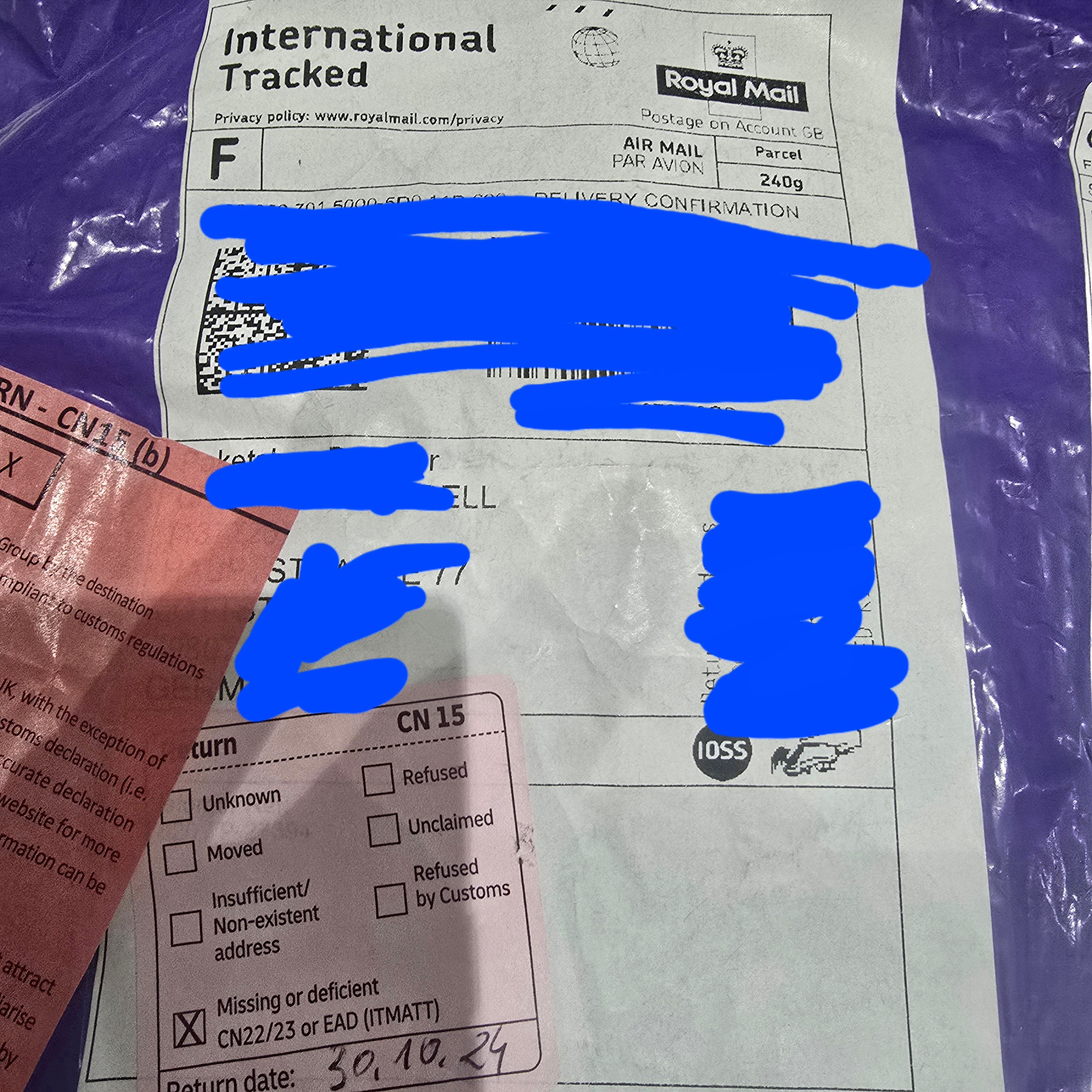 Other than not having a commercial invoice attached to the package, which is what we are going to start doing with our next shipping batch, we have no clue what is going on. The image at the start of this thread shows the same pink label we have had on our returns stating the CN22 is incomplete. We can’t add our EORI number because we have our VAT number on the customs label and you can’t have both at the same time. It’d help if German customs said ’ the CN22 is incomplete because of …’ but they don’t tell you want they need.