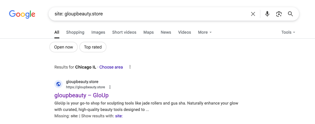 When I search “site:gloUpBeauty.store” on Google, your page is there - meaning your website already listed on Google but your ranking is not high. That’s why you can’t find your page from the search.