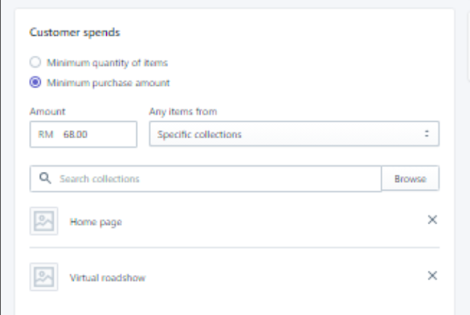 You’ve clearly set a minimum amount in your own discount for RM 68, which is great! You’ve also stipulated that a customer needs to buy a product from either the homepage collection or the virtual roadshow collection: