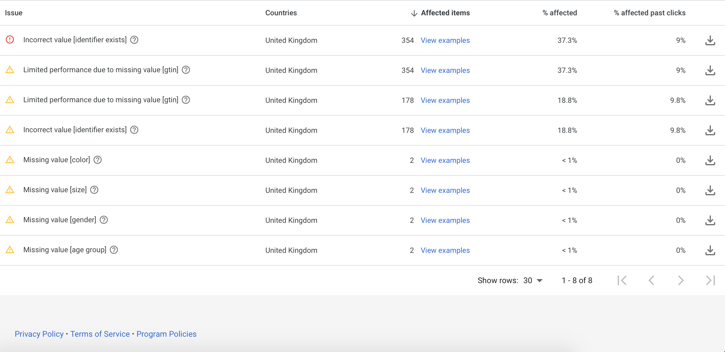 To get your products listed on Google, you need to resolve all the red warning issues that are shown in Google Merchant Center under Diagnostics.